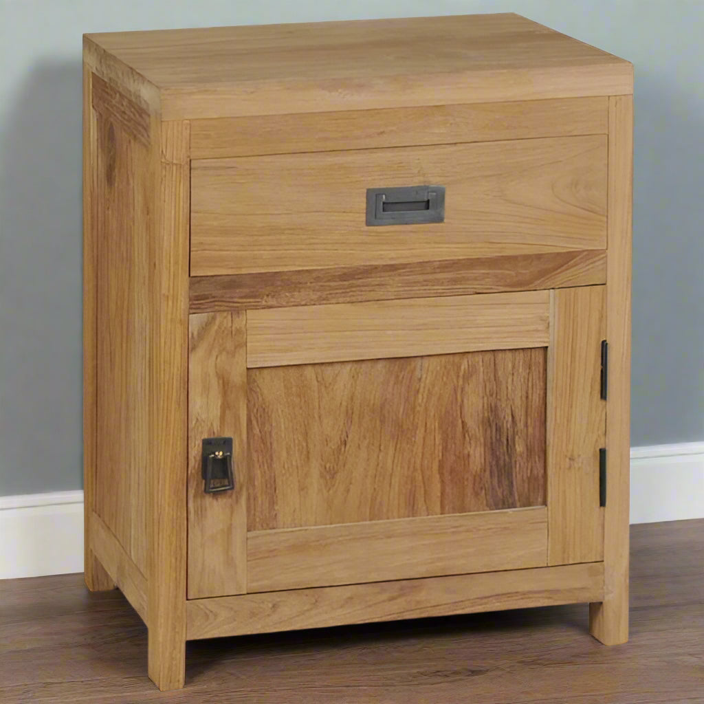 Rustic Solid Teak Bedside Cabinet with Drawer & Cupboard